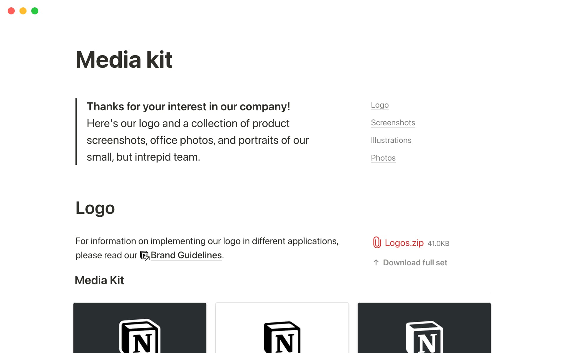 When journalists click on a media kit, they're looking for specific assets like logos or screenshots. Our media kit uses a gallery, split by asset type, to display all our files so folks can find what they need, fast.