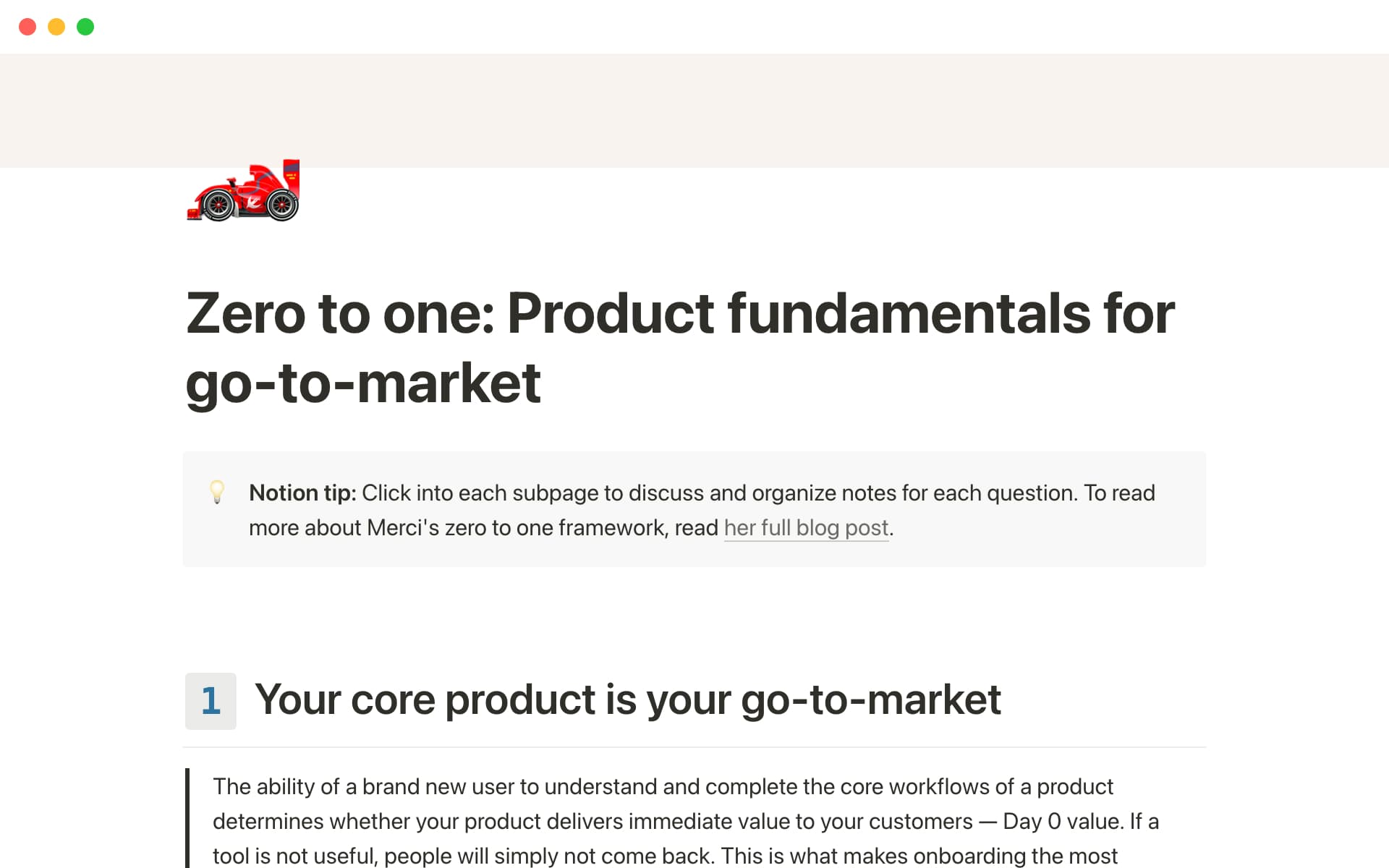 "The hardest thing about going from zero to one is not building something, it’s getting people to care about your product," says Merci. Discussing each of your four product fundamentals — core product, business model, positioning, first customers — will set you up well when you're ready to go to market. In the template, each discussion question has its own standalone page so you can write notes and gather ideas. Add images, video, and other embeddable content to help your team express their thoughts.