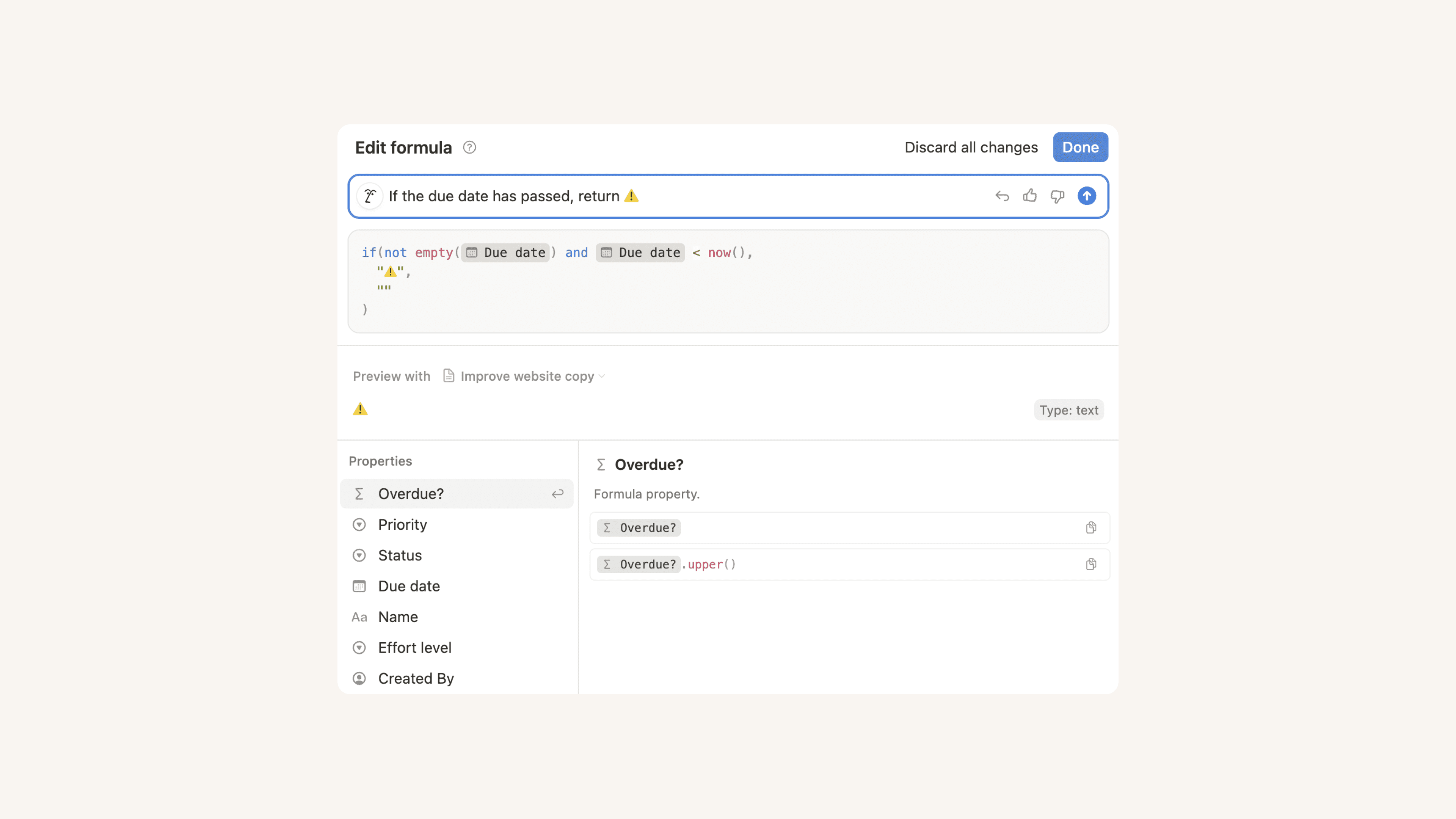 公式可以操作並傳回不同的資料類型。Notion 支援其他多種屬性類型,但會轉換其資料類型。